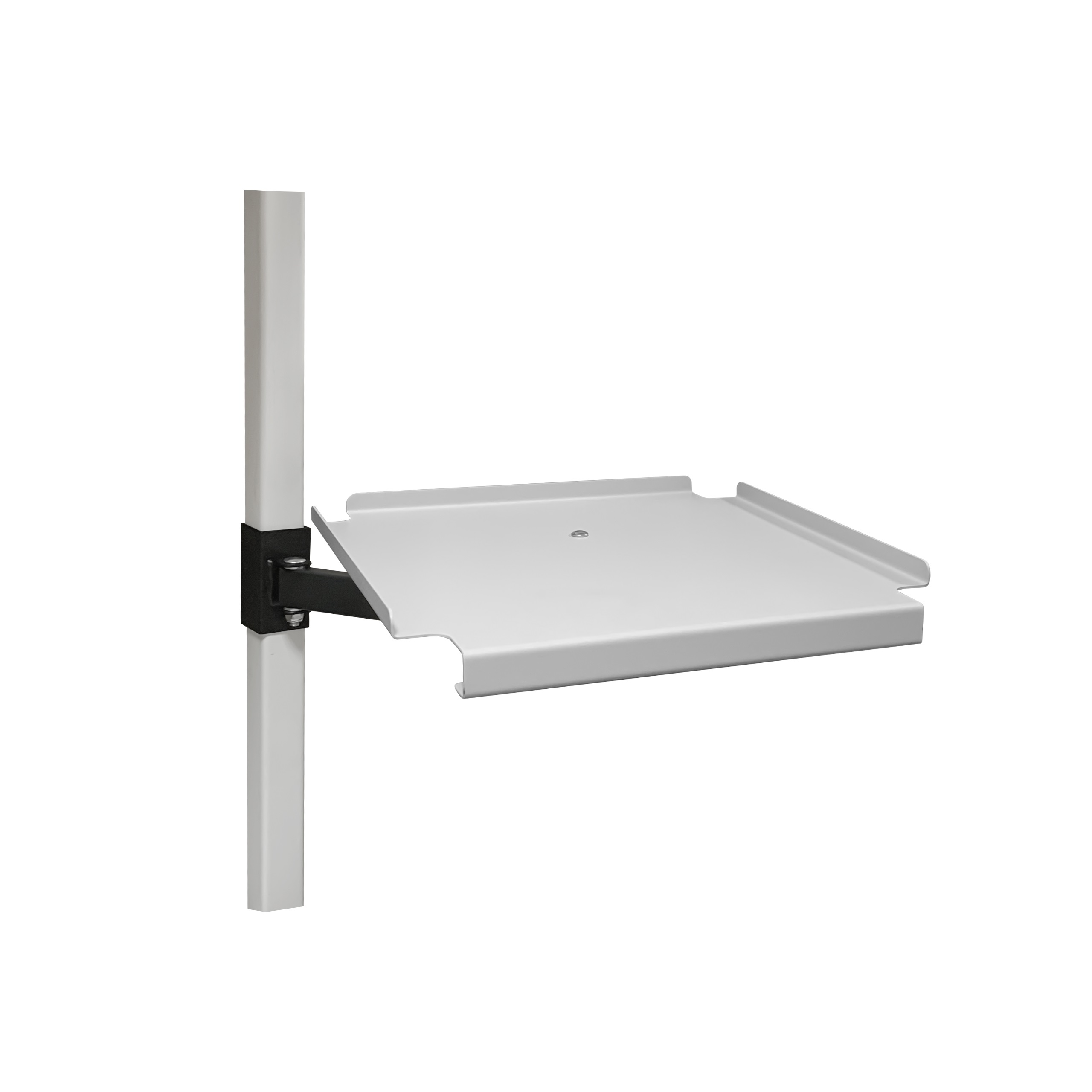 Используется для размещения различного рода портативной оргтехники, периферийных устройств и приспособлений. Металлическая площадка имеет габарит 320х320 мм, снабжена удобной ручкой для вращения и пазами для укладки электропроводов устройств. Конструкция кронштейна позволяет расположить подставку на нужном расстоянии от места крепления и под необходимым углом разворота. Рекомендуемая максимальная нагрузка на кронштейн - до 20 кг.