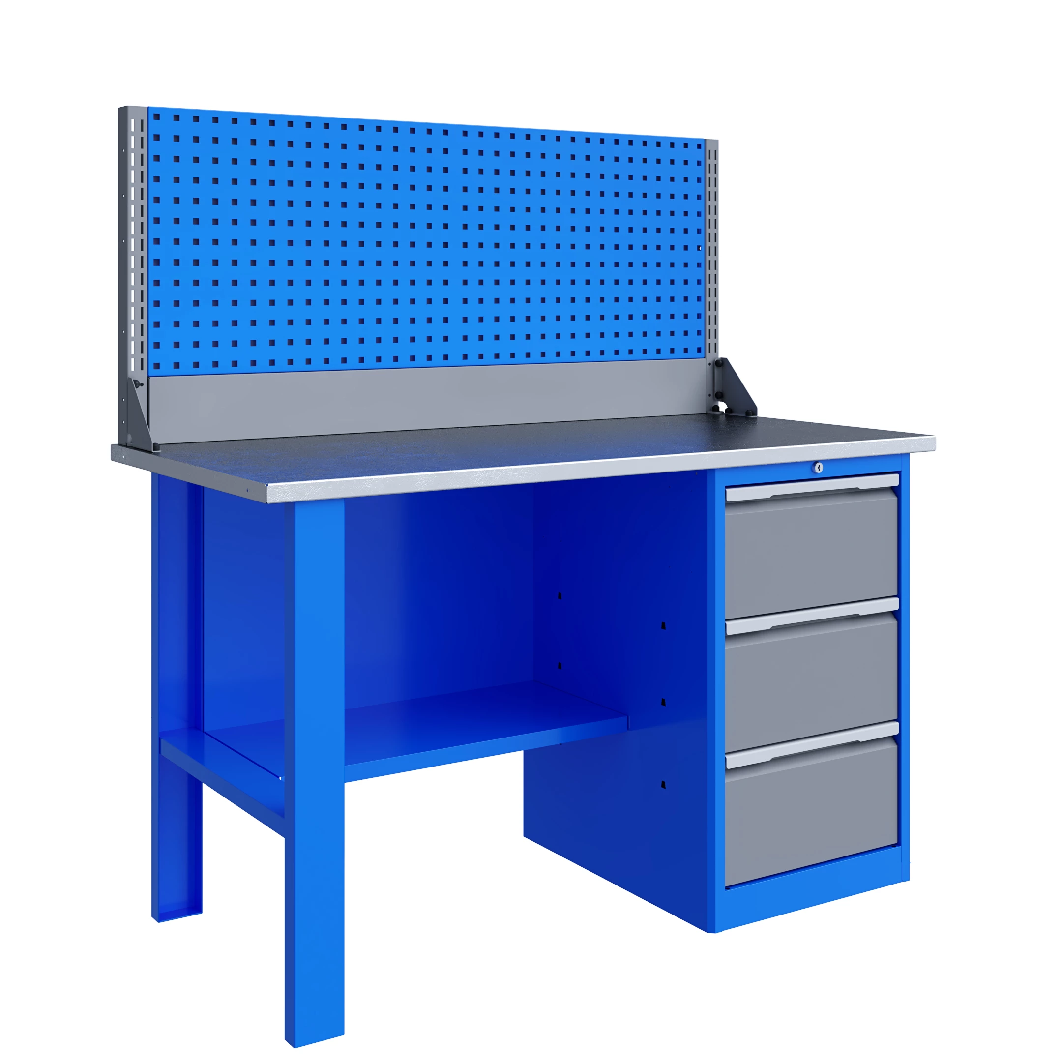 Верстак серии Technic 141.13.2-1 состоит из столешницы шириной 1396 мм, опоры, тумбы P3 с тремя большими ящиками, полки-стенки и одинарного экрана с кронштейнами.