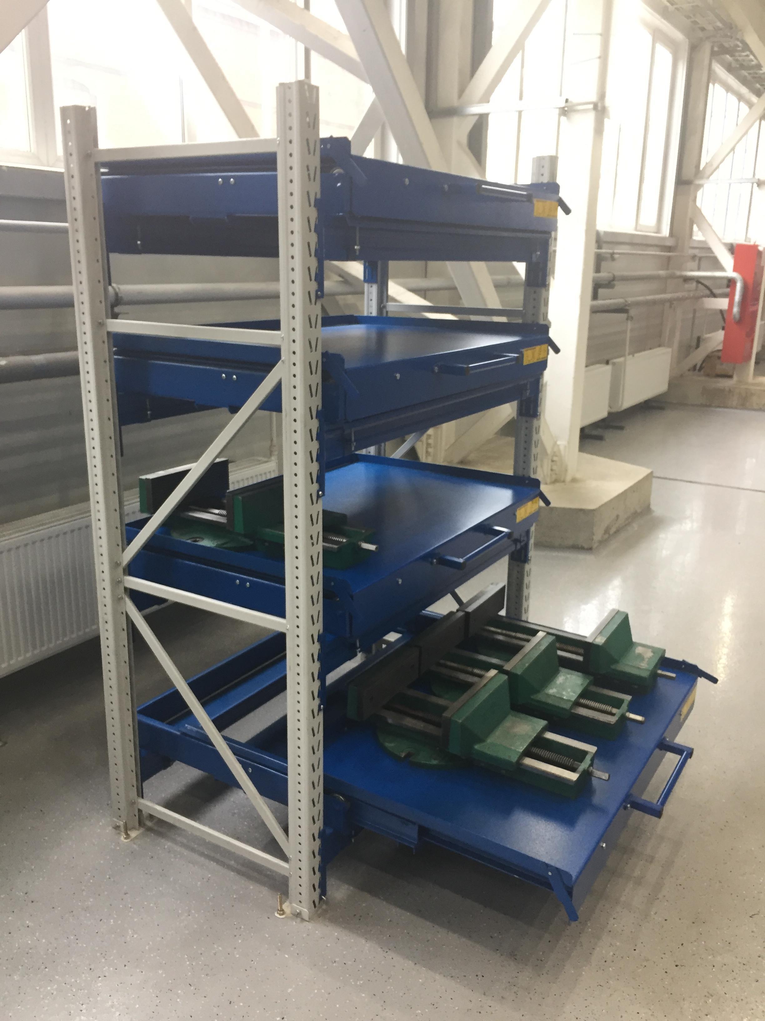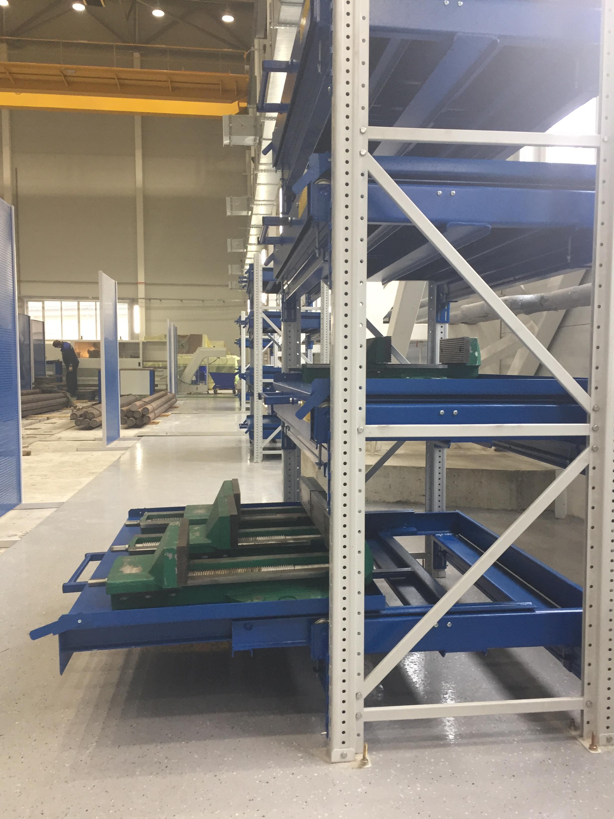 - Выкатные платформы на шарикоподшипниковых направляющих, закрепленных на балках стеллажа при помощи стяжных кронштейнов (4 шт/платформу), с ручкой и фиксатором (блокировка выкатывания)